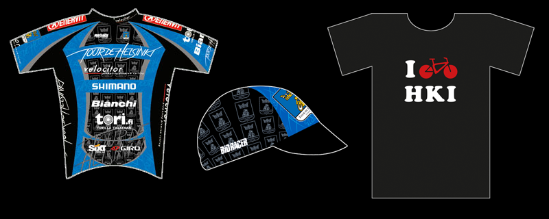 You can get the Tour de Helsinki branded items, the cycling outfit (jersey 67,00 EUR, bibs 67,00 EUR), cycling cap (15,00 EUR) and I Cycle Hki t-shirt (20,00 EUR) from the cycle store Velo & Oxygen (Itäkeskus, shopping centre Puhos, Kastelholmantie 2): http://www.velo-oxygen.fi
